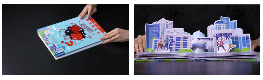 選擇以災害風險中與百姓最為貼近的地震災害作為切入口,通過采用近些年成為科普新風尚的“互動立體書”的方式,擇取學校、社區、醫院等常見人員密集場所進行場景機關設計,對地震知識、地震避險知識、地震標準等相關內容進行拆解重組展示介紹。“動手閱讀”的立體書,將枯燥的科普知識轉變為引導式探索,賦予了閱讀趣味性,有效觸發目標受眾好奇心與閱讀探索欲。