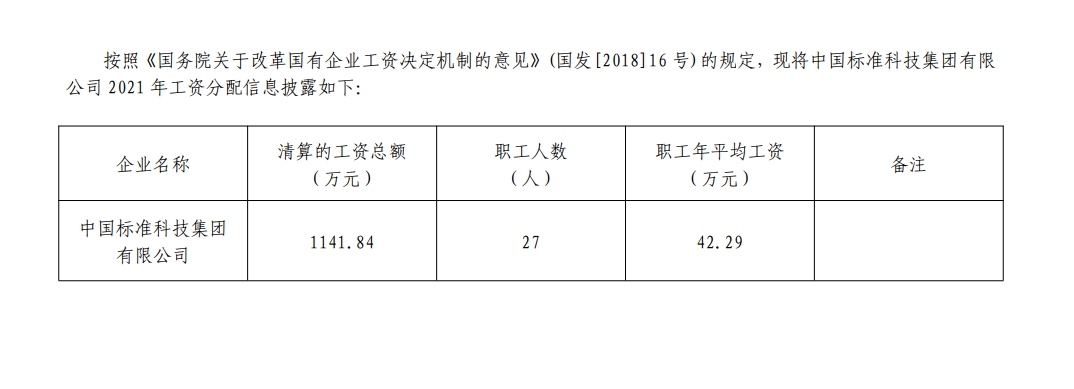 2021年中國標準科技集團有限公司工資分配信息披露