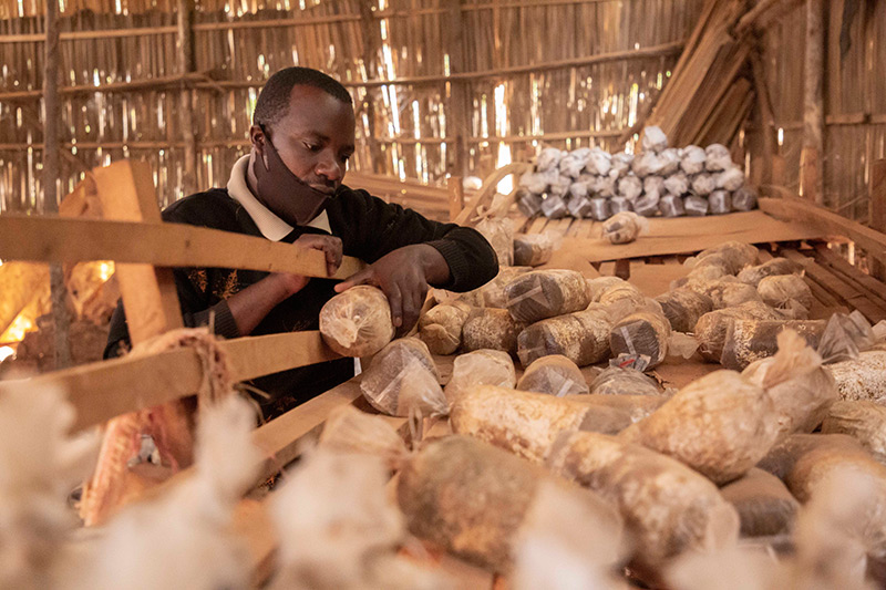 在盧旺達(dá)首都基加利的一家食用菌培育作坊,作坊主人埃馬紐埃爾·阿希馬納檢查菌袋(2020年9月9日攝)。中國福建農(nóng)林大學(xué)的菌草專家2006年來到盧旺達(dá)開始菌草技術(shù)合作項(xiàng)目,在當(dāng)?shù)厥痉逗屯茝V菌草技術(shù)。新華社發(fā)(西里爾·恩德格亞 攝)