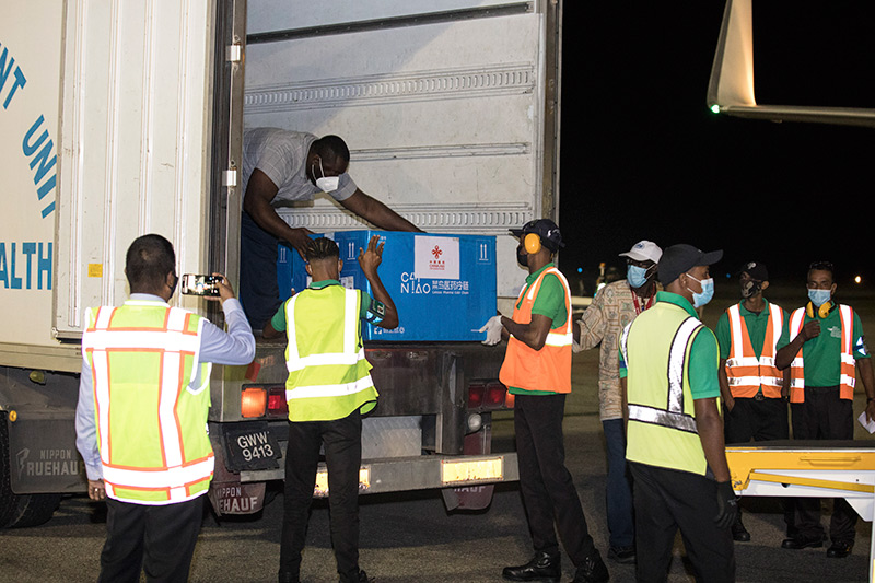 工作人員在圭亞那首都喬治敦國際機(jī)場搬運(yùn)中國援助的新冠疫苗(2021年3月2日攝)。新華社發(fā)(圭亞那新聞署供圖)