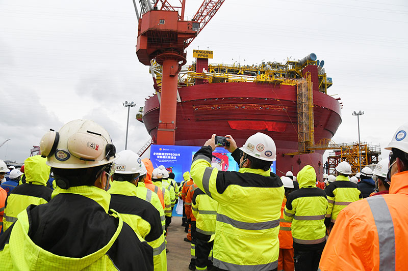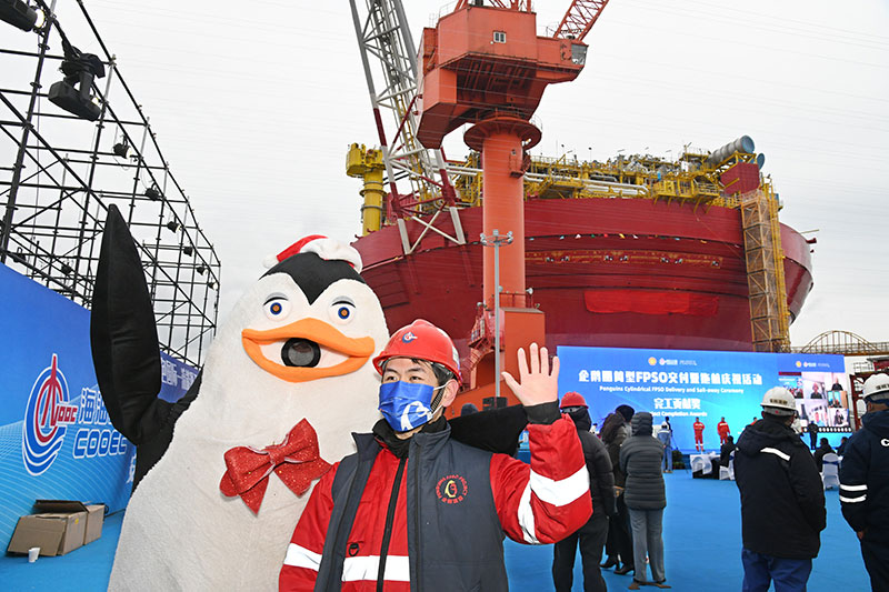 11月29日,一名工人在企鵝圓筒型浮式生產儲卸油裝置(FPSO)交付儀式上與吉祥物合影。