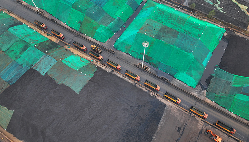 11月28日,在江蘇連云港港煤炭碼頭,車輛在轉運到港的電煤(無人機照片)。