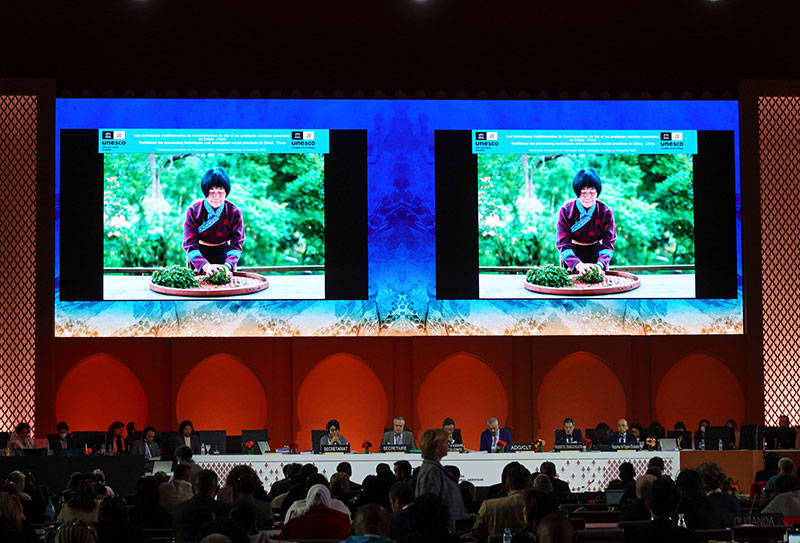 11月29日,在摩洛哥拉巴特的聯(lián)合國(guó)教科文組織保護(hù)非物質(zhì)文化遺產(chǎn)政府間委員會(huì)第17屆常會(huì)會(huì)議現(xiàn)場(chǎng),我國(guó)申報(bào)的“中國(guó)傳統(tǒng)制茶技藝及其相關(guān)習(xí)俗”項(xiàng)目接受評(píng)審。